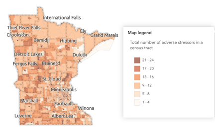 In support of the Cumulative Impacts Rule, the MPCA has drafted a Cumulative Impacts Mapping and Analysis Platform. The goal of the tool is to visualize what environmental and social factors affect different areas, as well as how many different factors are present at “Above Threshold” levels in a location. The tool is still in the draft phase, meaning that some of the technical guidance, contact information, and language translations are not available yet.